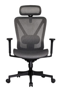 כיסא משרדי מעוצב בגוון אפור, עם משענת ראש מובנית המעניקה תמיכה מלאה לצוואר ולגב העליון. שילוב בין נוחות, עמידות וקו עיצוב אלגנטי – פתרון אידיאלי למשרד מודרני או לפינת עבודה ביתית.